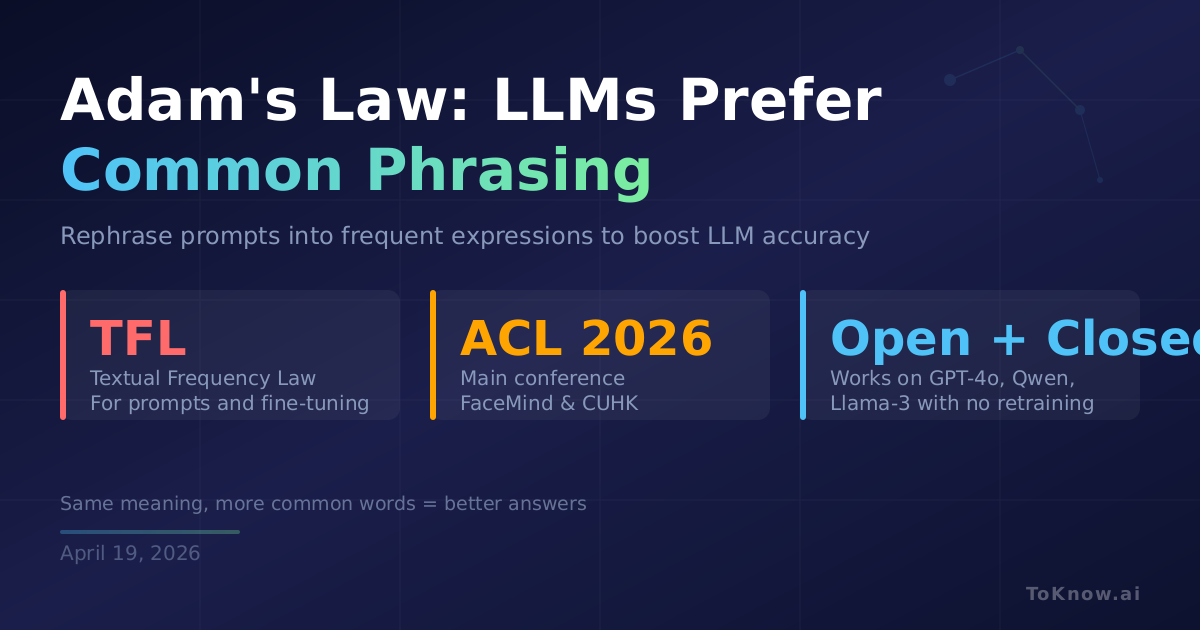 Researchers at FaceMind and the Chinese University of Hong Kong have formalized something prompt engineers have long suspected: LLMs are better at understanding sentences phrased the way most people on the internet phrase them. Their paper, Adam’s Law, accepted at ACL 2026, proposes a Textual Frequency Law (TFL) stating that frequently occurring textual expressions are systematically easier for LLMs to handle, both at prompting time and during fine-tuning. The team built an input paraphraser that estimates sentence-level frequency using web resources, then rewrites prompts into more common phrasings without changing meaning. The same principle drives a fine-tuning data filter that prefers high-frequency expressions. Across reasoning, code, and instruction-following benchmarks, applying TFL improved performance for both closed-source models like GPT-4o and open-weight models like Qwen2.5 and Llama-3, with no architectural changes.