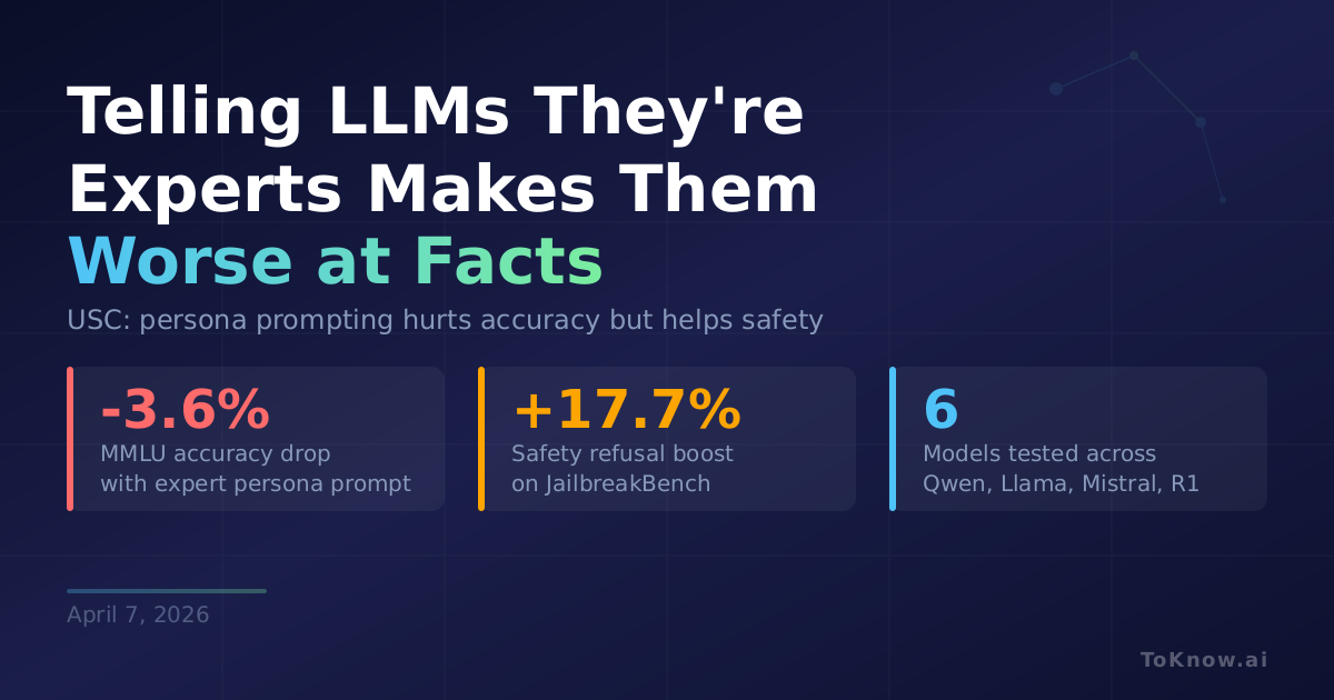 USC researchers found expert persona prompts drop LLM accuracy by 3.6% on knowledge benchmarks. Personas help style and safety but hurt math, coding, and factual recall.