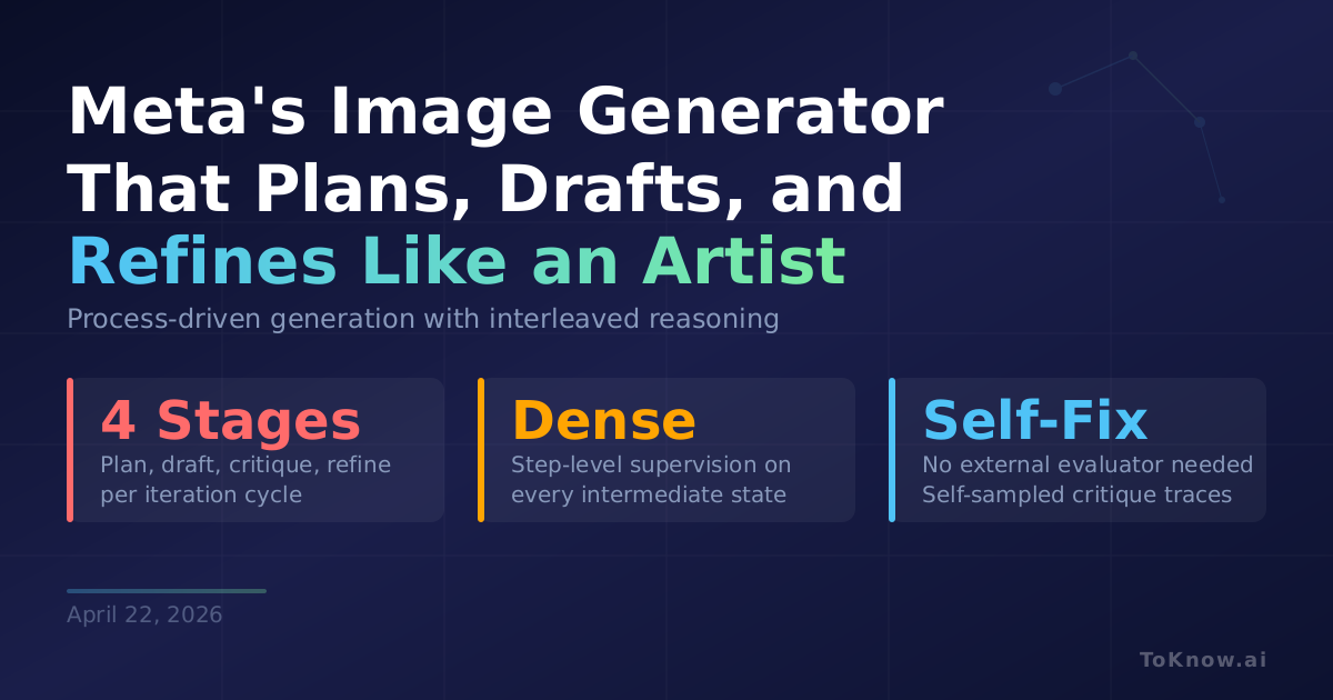 Researchers at Meta AI (FAIR) have built an image generation system that works the way a human painter does: plan what to draw, sketch a draft, look at what’s wrong, then fix it. Instead of producing an image in a single pass, the model follows an interleaved reasoning trajectory across four stages per iteration: textual planning (deciding what to draw next), visual drafting (generating the current state), textual reflection (critiquing the draft against the prompt), and visual refinement (correcting what the critique identified). Each stage receives dense step-level supervision, meaning the model is trained not just on final outputs but on every intermediate state. Self-sampled critique traces teach the model to spot and fix its own errors without needing a separate evaluator. On standard text-to-image benchmarks, this approach significantly outperforms single-shot generation in compositional accuracy, the ability to correctly arrange multiple objects with specific attributes and spatial relationships.