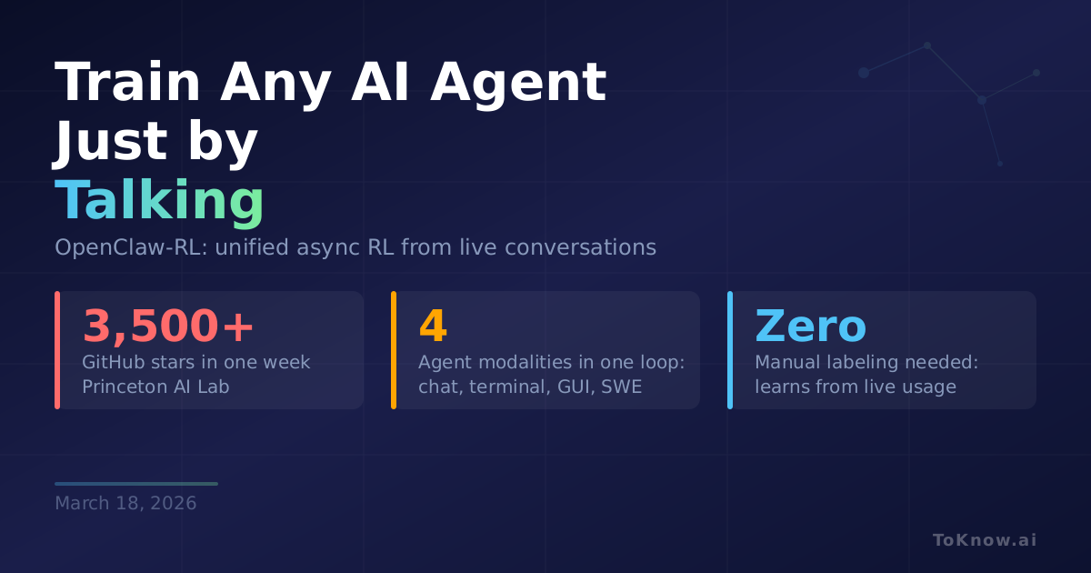 Princeton AI Lab’s OpenClaw-RL (Reinforcement Learning) proposes a simple but powerful idea: every time you interact with an AI agent, the agent’s next state (your reply, a terminal output, a GUI change, a test result) contains a usable training signal. The framework treats personal conversations, terminal commands, GUI interactions, software engineering tasks, and tool calls not as separate training problems but as inputs to a single, unified reinforcement learning loop. It extracts two kinds of information from each interaction. First, evaluative signals: a process reward model (PRM) scores how well the action performed as a scalar reward. Second, directive signals: a technique called Hindsight-Guided On-Policy Distillation (OPD) uses textual hints from the next state to construct richer, token-level guidance telling the model how it should have responded differently. The entire system runs asynchronously: the model serves live requests, the PRM judges interactions, and the trainer updates weights, all at the same time with zero coordination overhead.