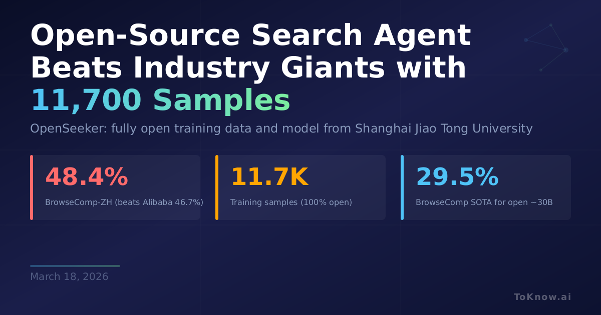 Researchers at Shanghai Jiao Tong University released OpenSeeker, the first search agent to open-source both model weights and 100% of its training data. Built on Qwen3-30B-A3B (a 30B-parameter mixture-of-experts model with 3B active parameters), it was fine-tuned on just 11,700 synthesized samples using a single round of supervised fine-tuning, with no reinforcement learning or continual pre-training. Two techniques make the data work: fact-grounded QA synthesis, which reverse-engineers the web graph to generate complex multi-hop questions, and denoised trajectory synthesis, which uses retrospective summarization to clean up the messy HTML context that web-browsing agents encounter. The result: 48.4% on BrowseComp-ZH, beating Alibaba’s Tongyi DeepResearch (46.7%) despite Alibaba using a far heavier pipeline of continual pre-training, SFT, and RL. On English benchmarks, it scores 29.5% on BrowseComp, 74.0% on xbench, and 59.4% on WideSearch, all state-of-the-art for open models of comparable size.