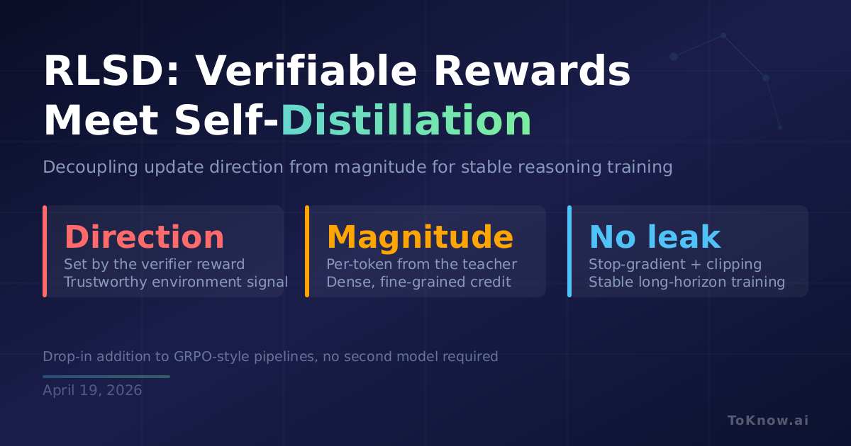 A new method, RLSD, fixes the information-leakage problem in on-policy self-distillation by letting the environment pick the update direction and the teacher only set the magnitude. It hits a higher convergence ceiling than RLVR or OPSD alone.