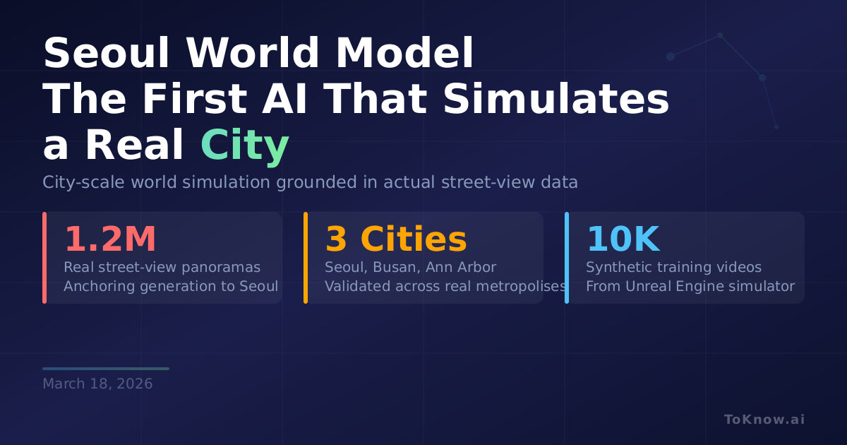 NAVER AI Lab and KAIST released Seoul World Model (SWM), the first city-scale world model that generates video of a real city rather than an imagined one. Given a location, camera path, and optional text prompt, SWM retrieves nearby images from 1.2 million street-view panoramas of Seoul and uses them to anchor each video segment to actual buildings, roads, and landmarks. Cross-temporal pairing forces the model to learn permanent structure rather than copy transient objects like parked cars. A Virtual Lookahead Sink re-anchors each segment to a reference image further ahead on the route, preventing quality drift over long distances. Tested on three cities, SWM outperforms existing video world models in spatial fidelity and consistency over trajectories of hundreds of meters.